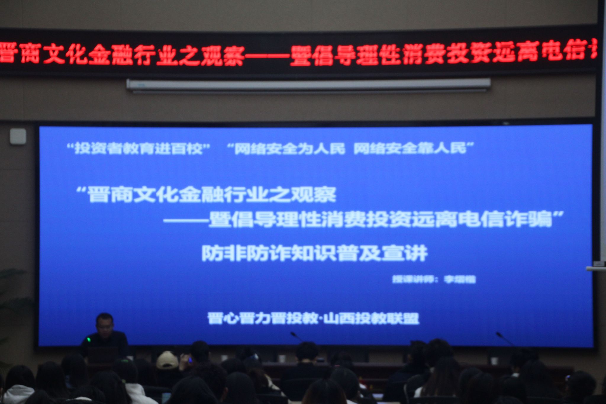 为了加强金融知识宣传教育,提高广大学生对于电信网络新型诈骗犯罪行为的警惕性,维护金融消费者合法权益,进一步增强教师、学生的防骗意识,提升识骗能力。管理学院于2023年11月26日19:00在山西工程科技职业大学东区图书馆第二报告厅开展“晋商文化金融行业之观察暨倡导理性消费投资远离电信诈骗”活动。参与本次活动的有并州分公司并州营业总经理蒋杨女士,山西证券股份有限公司并州分公司并州南路营业部财富部经理王晓琼女士,山西证券股份有限公司投教基地李熠楷老师以及21级、22级、23级学生代表参加。本次活动的主讲人为李熠楷老师。