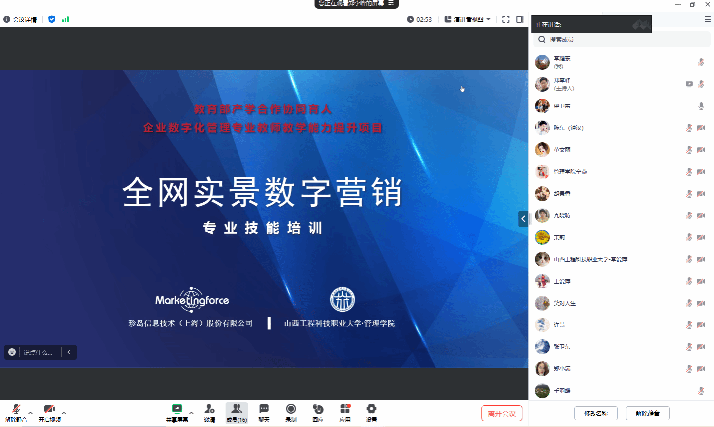 为提高教师的专业技能,更好地满足实践教学需求,推进校企深度合作,管理学院于2024年3月14日晚7:30在腾讯会议举办了“全网实景数字营销”专业技能提升培训。本次培训由我院合作企业珍岛信息技术(上海)股份有限公司金牌讲师郑李峰主讲,企业数字化管理和市场营销专业全体教师及其他专业相关教师参加了此次培训。