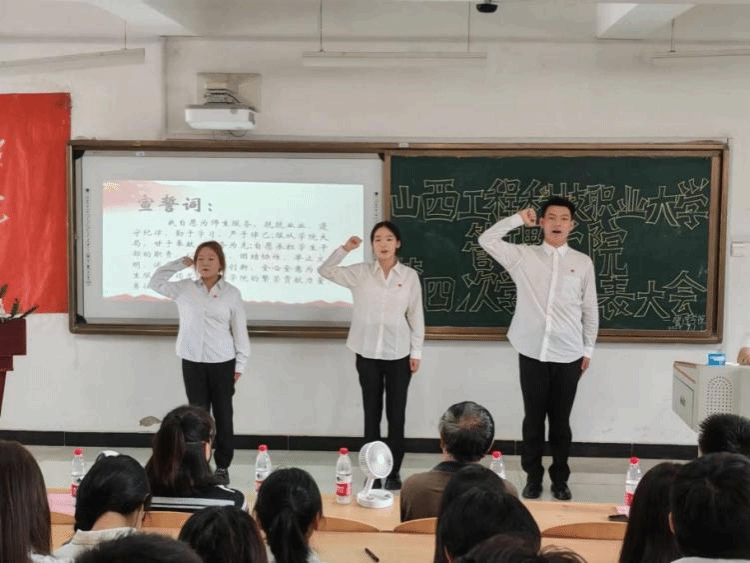 随后,大会总监票人高振华老师宣布本次大会计票结果,由管理学院综合办公室负责人苗峰老师宣布选举结果:聂云辉、马悦、王轲晶三位同学当选为山西工程科技职业大学管理学院第四届学生会主席团成员。之后,管理学院第四届学生会主席团成员进行就职宣誓。宣誓完毕后,管理学院团委书记李少华老师为第四届学生会主席团成员颁发了任职聘书。接下来,管理学院第三届团学组织代表冯卓雅同学致倡议书。