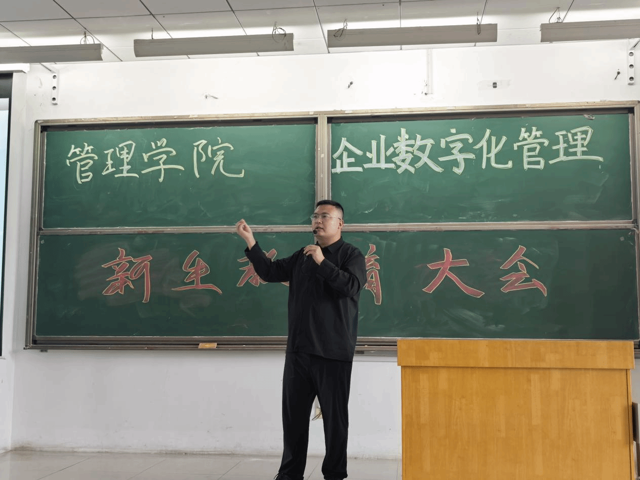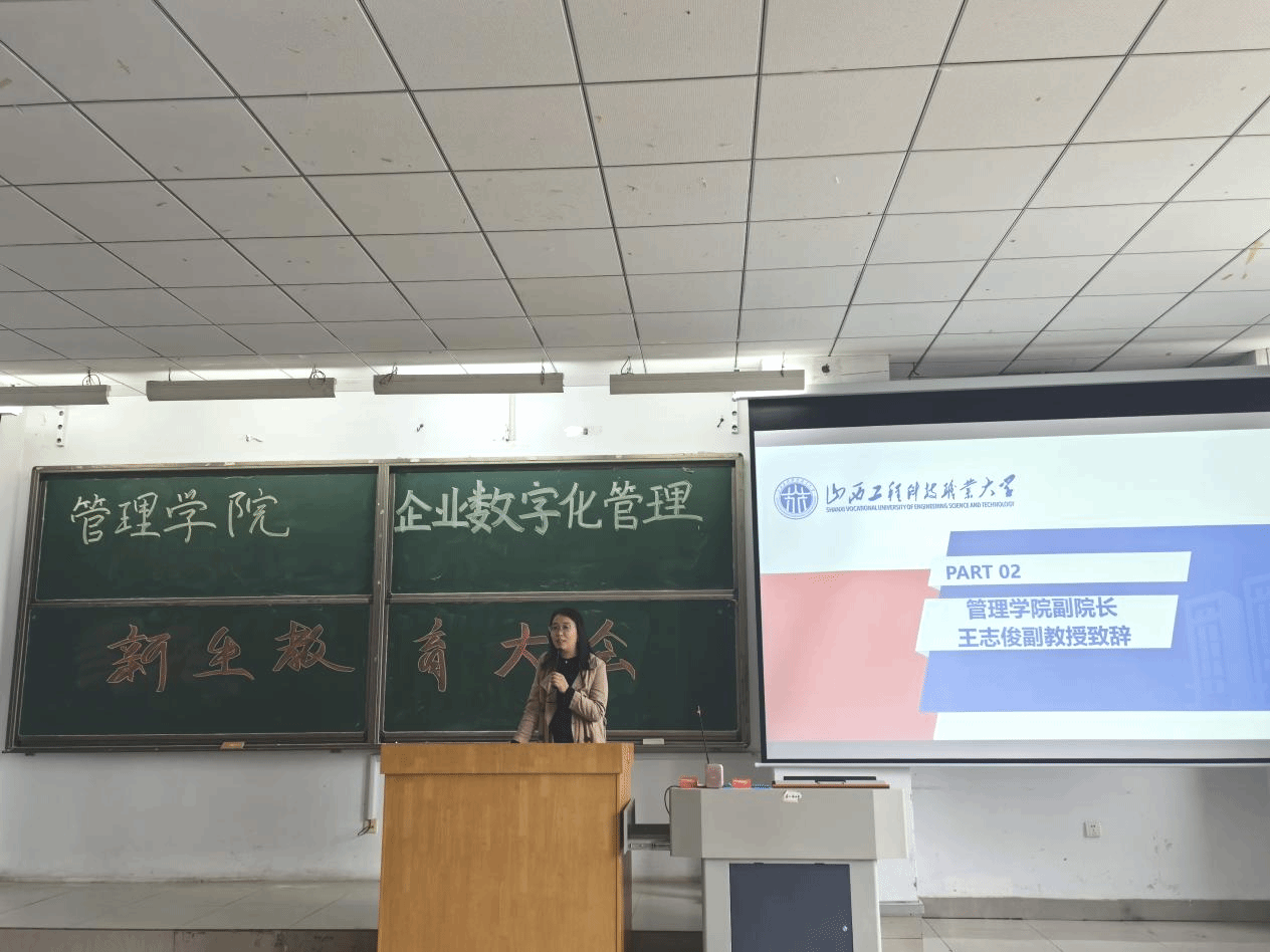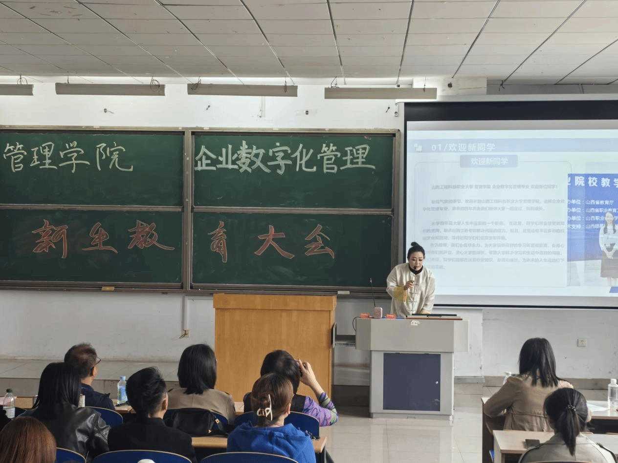 为帮助新生了解专业情况,增强学习信心,2025年9月23日下午14时,管理学院2025级企业数字化管理专业新生入学教育活动在4号教学楼T04教室顺利举行。本次活动以“校企协同赋能新生成长”为特色,特邀企业导师代表及优秀毕业生代表参与分享,旨在帮助新生快速融入大学生活、深入了解专业内涵与发展前景,为未来四年的学业规划与职业发展筑牢基础。学院领导、企业数字化管理专业全体教师、山西觀鸿酒业有限公司总经理赵思硕、山西博亨建设工程有限公司董事长乔飞雄两位企业导师、2022级学生代表张小蓉同学、2021级优秀毕业生代表阎初磊同学及2025级全体新生共同参与,活动由企业数字化管理专业教研室主任杨虹副教授主持。