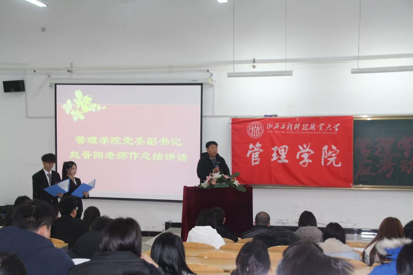 为严肃考纪,筑牢考风考纪教育坚固防线,引导同学们诚信应考,自觉维护考试公平。管理学院于1月6日下午14:00在11号楼T18教室开展诚信应考动员大会。管理学院党委副书记赵晋阳、学工办主任高振华、团委书记苗峰,学院专职辅导员胡丽敏、李少华、王湛,以及各班级、部门代表参加此次大会。